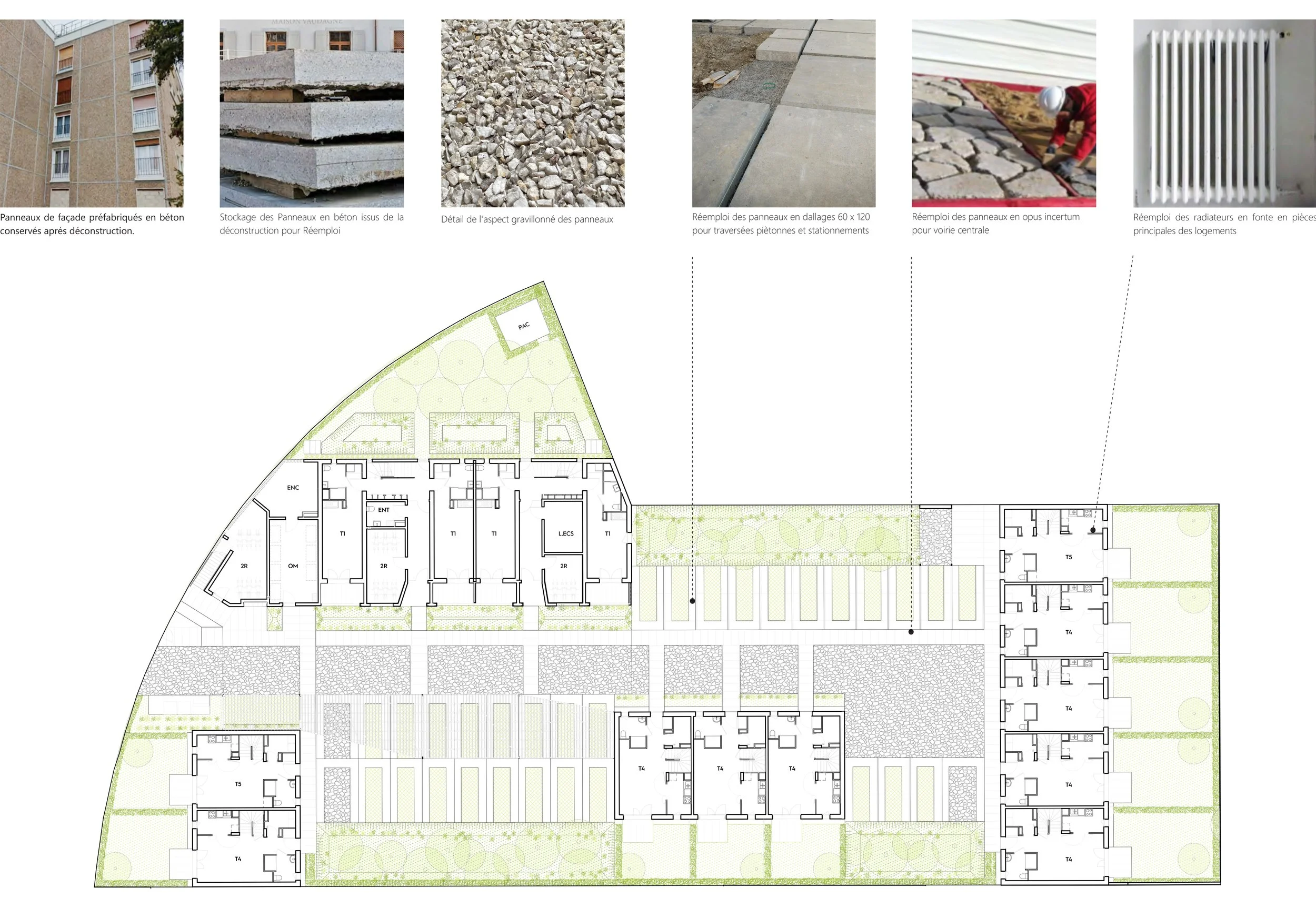 FAÇADES PLANCHERS BÉTON ISSUS DE LA DÉCONSTRUCTION POUR PAVAGE + RADIATEURS EN FONTE